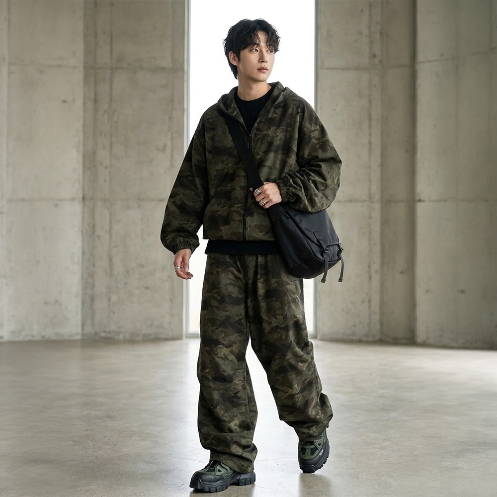 ACC 2002-2003M 남자 아웃도어 밀리터리 카모 전술 후드 집업 와이드 팬츠 상하의세트